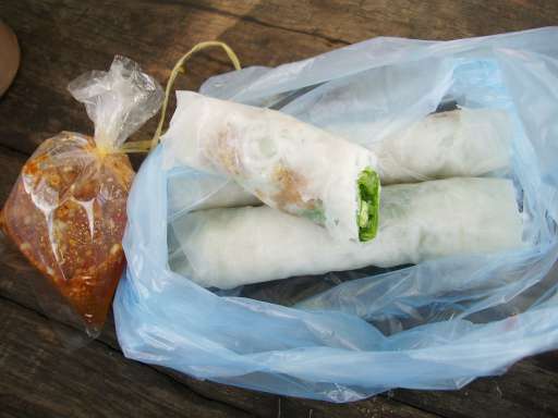 米でできた皮をくるくる巻き、中にビーフン、どくだみ、レタス、いんげん、ところどころに揚げ豚皮が入っている。